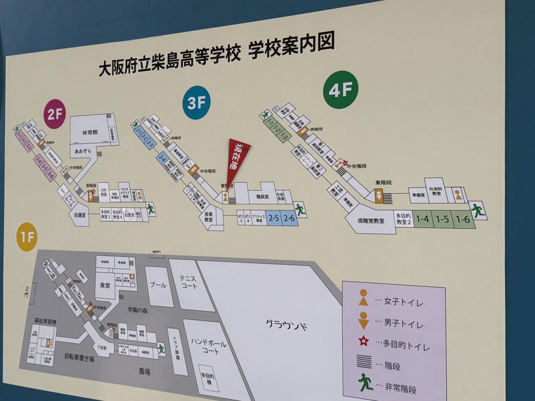 授業によっては、今まで馴染みのなかった教室に行くこともあり、「えっ? どこ??」という声がよく聞こえてきます。そんな時に活用して欲しいのが、各階の階段横に貼ってある、この「学校案内図」。