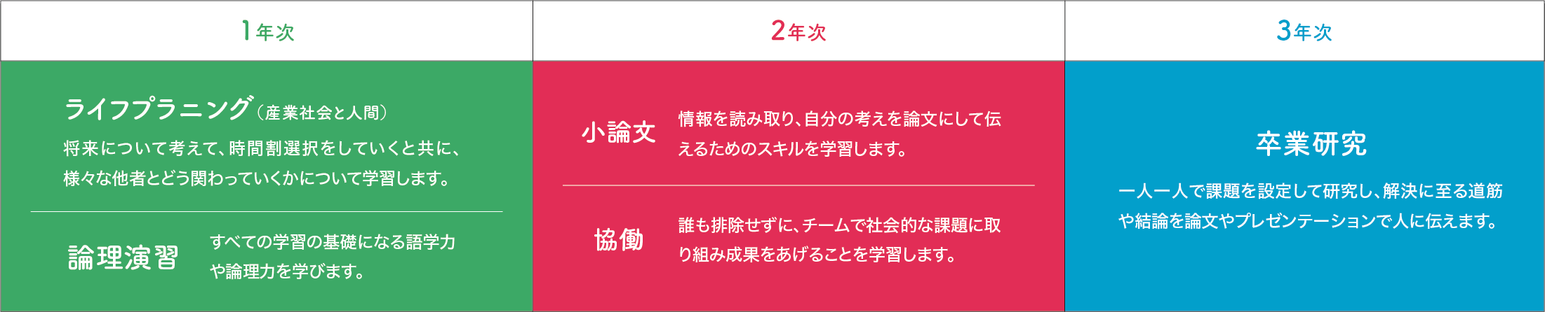 「コアカリキュラム」とは「柴島高校がどんな教育を大事にしているのか」が明確にわかる授業群です。 1年生から3年生までリンクした授業で様々な考え方を身に付けます。